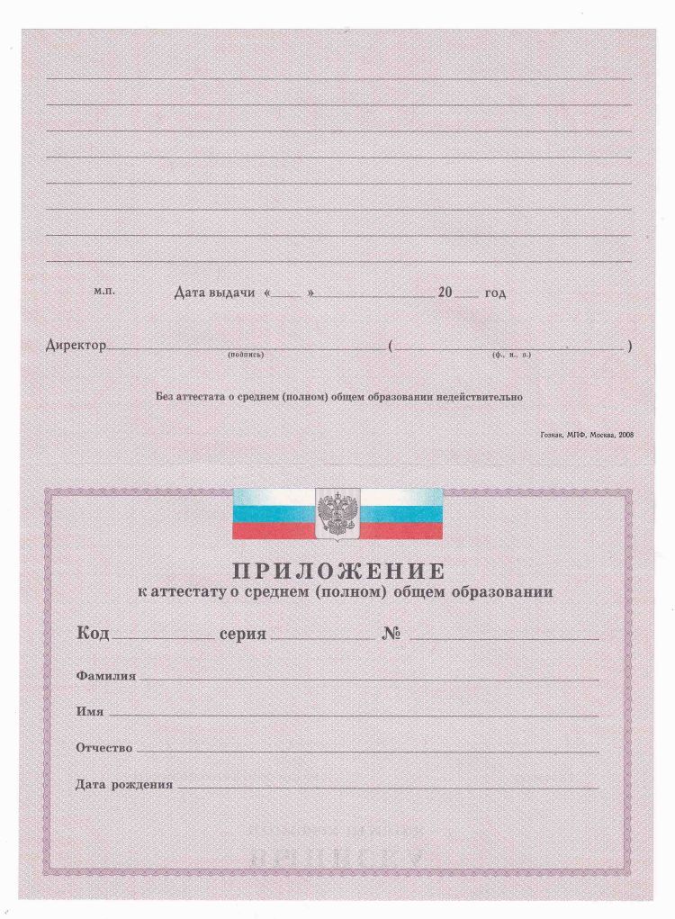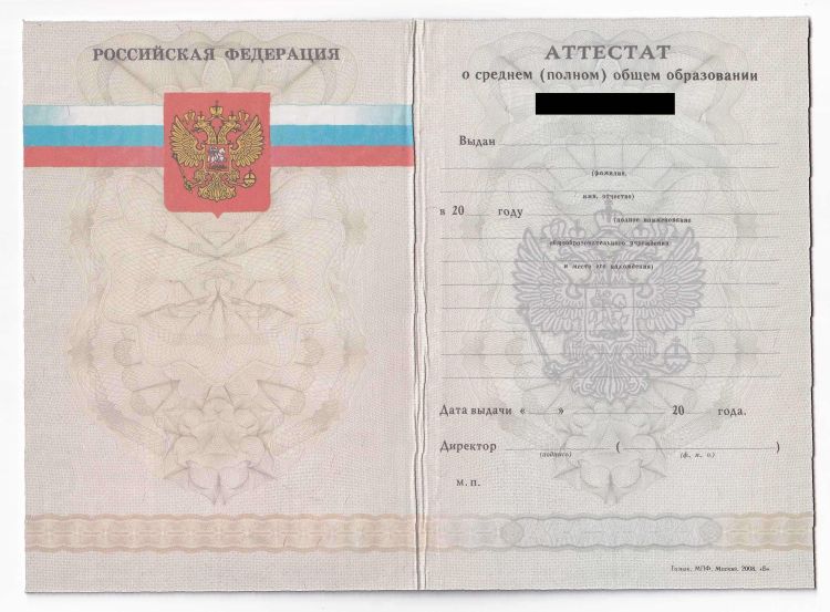 Аттестат школы за 11 классов, доступные с годами выдачи с 2007 по 2009. Используем оригинальные бланки ГОЗНАК с подписями и печатями, полная комплектация включает корочку, бланк аттестата и приложение.