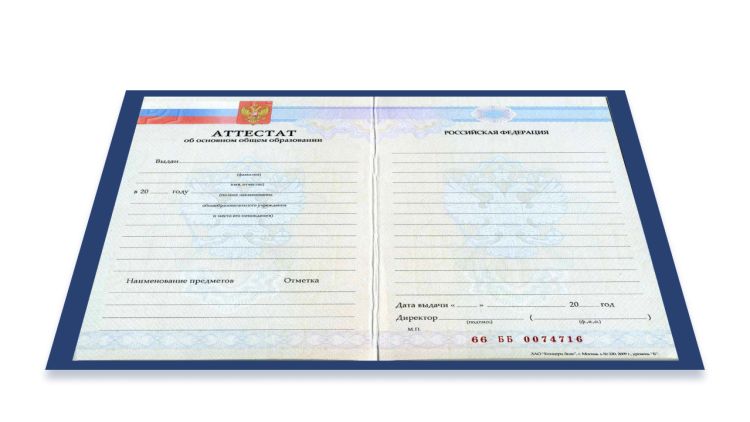 Аттестат школы за 9 классов, доступные с годами выдачи с 2014 по 2025. Используем оригинальные бланки ГОЗНАК с подписями и печатями, полная комплектация включает корочку, бланк аттестата и приложение.