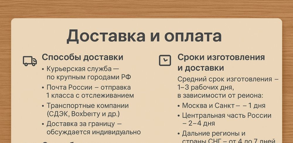 - Доставка за границу — обсуждается индивидуально. Работаем с ЕС, СНГ и другими странами.